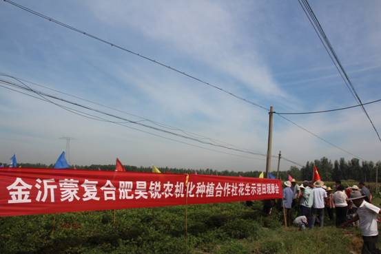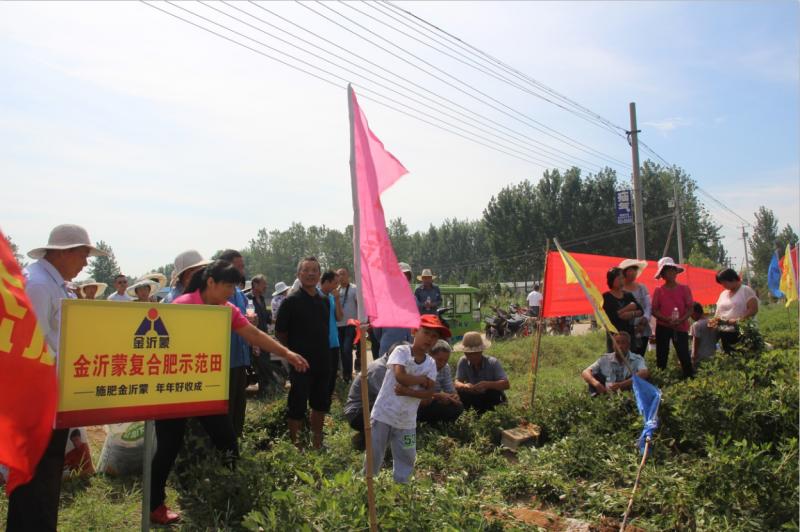 據了解,這片示范田所在的地塊土質較差,原來種植花生不僅長勢不好,還存在嚴重的死秧現象,導致產量低,收入少,本村的村民普遍不愿意種植。后來這片地被昊銳農機化種植專業合作社進行土地流轉集中管理,本季花生用肥采用了金沂蒙54%(18-18-18)復合肥+有機肥的套餐。施用之后,效果顯現,現在花生即將收獲,為了向附近村民展示金沂蒙復合肥的效果,金沂蒙聯合昊銳農機化種植合作社共同舉行了此次花生示范田觀摩會。