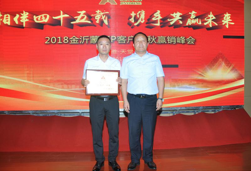金沂蒙復合肥在在豫北市場的發展中,培養了大批的忠誠客戶,杞縣玉峰農業生產資料有限公司就是其中的優秀代表。十幾年來,玉峰農業生產資料有限公司與金沂蒙風雨同舟,攜手前行,與金沂蒙一起成長,一起壯大,結下了深厚的友誼。會上,金沂蒙生態肥業銷售副總袁峰特別給玉峰農業生產資料有限公司的總經理郭玉峰頒發了“鉆石級VIP客戶獎”,以表彰其在合作過程中的突出貢獻。