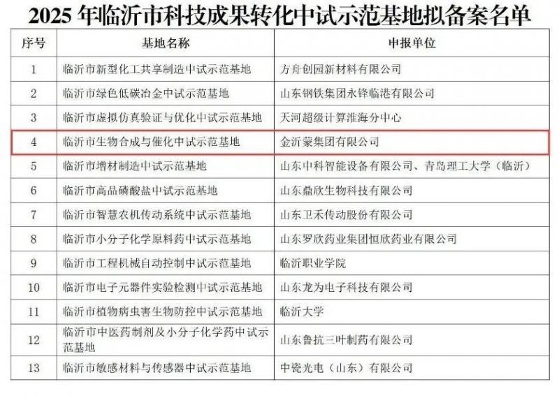 近日,臨沂市科技局公示了2025年臨沂市科技成果轉化中試示范基地備案名單,金沂蒙集團有限公司建設的臨沂市生物合成與催化中試示范基地榜上有名。