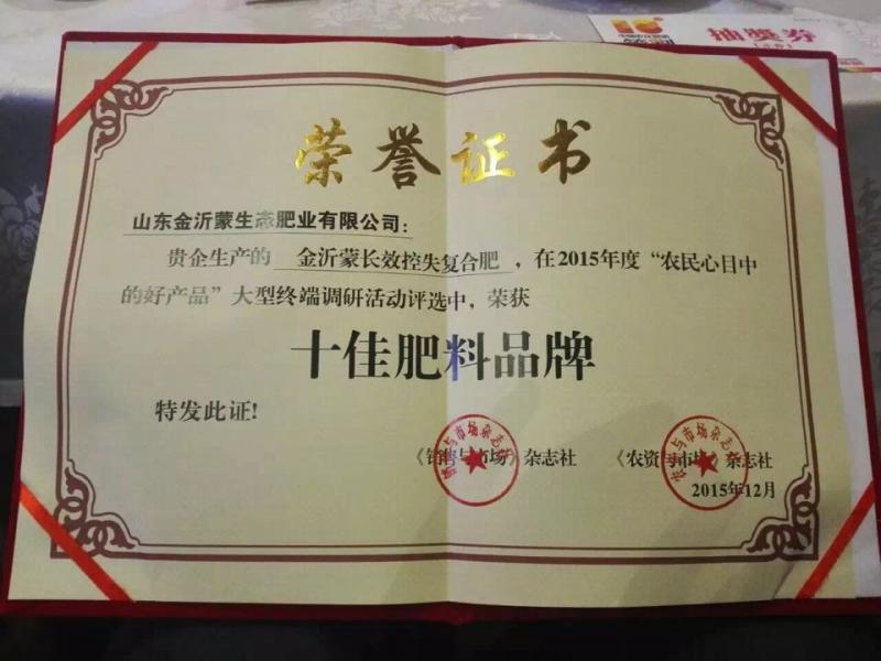 2015年12月23日,由《農資與市場》雜志社發起并主辦的2015年度“農民心目中的好產品”活動頒獎典禮在武漢歐亞會展國際酒店隆重舉行。此次調研活動足跡涵蓋全國,采取線上與線下同步開展的方式調研,評選出了十佳肥料好產品品牌等獎項。山東金沂蒙生態肥業有限公司的長效控失肥成功入選,至此,山東金沂蒙生態肥業已經連續五年榮膺該獎項。