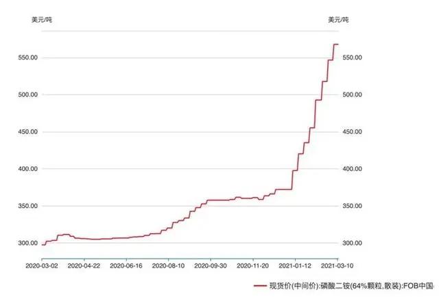 數據顯示,截至3月12日,由中國出口的磷酸二銨離岸價已連續上漲12周至580美元/噸,較去年同期上漲88.74%。